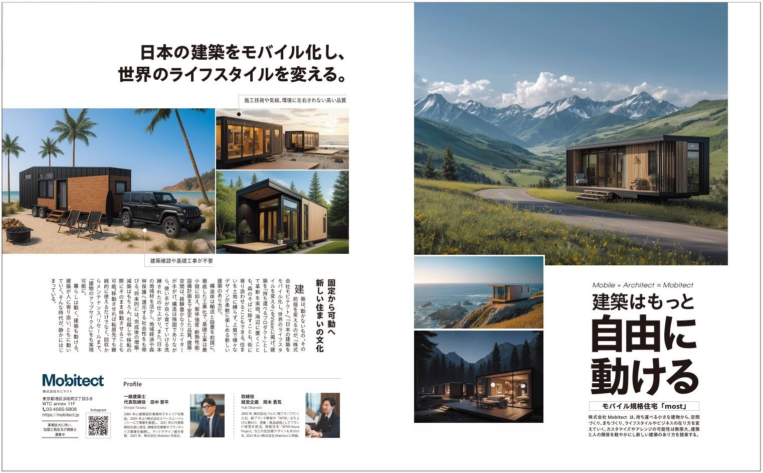 “建築はもっと自由に動ける”をテーマに、建築を「持ち運べるプロダクト」とする株式会社Mobitectの新しい住まいの革新が紹介されています。